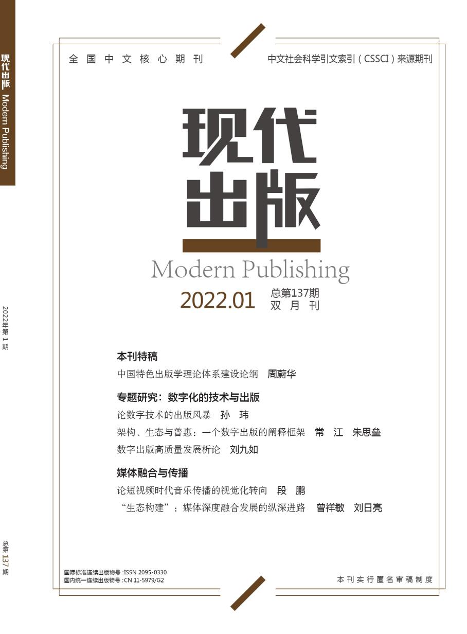 《现代出版》,由教育部主管,918博天堂(中国区)官方网站出版社有限责任公司和中国大学出版社协会主办。刊物以宣传党和国家出版政策,弘扬现代出版文化,反映改革发展动态,交流理论研究成果,服务现代出版事业为宗旨,为全国中文核心期刊、中文社会科学引文索引(CSSCI)来源期刊、人大复印报刊资料重要转载来源期刊。刊物逢单月20日出版,邮发代码:80-431,定价20元,单期112个版面,设有“本刊特稿”“理论前沿”“媒体融合与传播”“出版名家”“出版经营与管理”“出版史研究”“出版教育研究”“实践视域”“出版人圆桌论坛”等栏目,并不定期推出专题研究。
